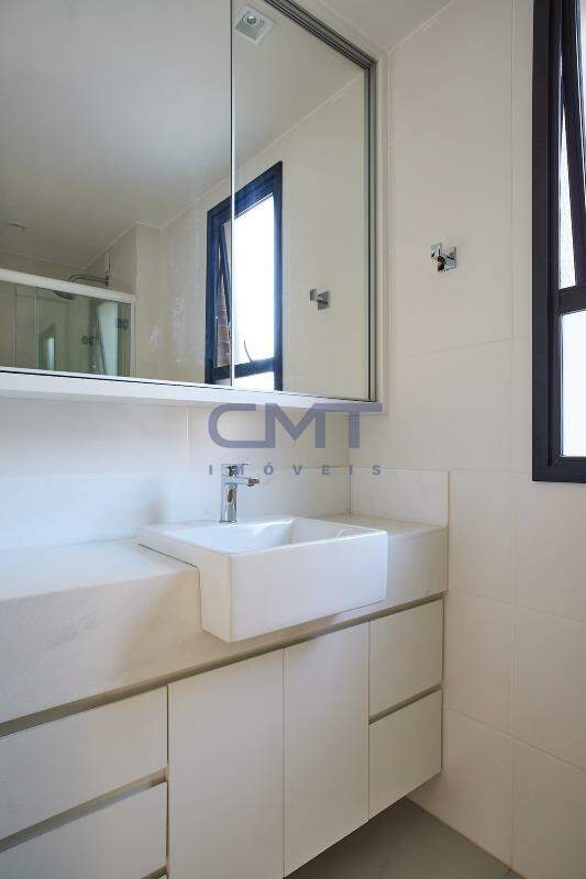 2 amplos banhos, sendo 1 suíte, e 1 social. Ambos com piso em porcelanato, armários planejados e bancada em mármore com cuba sobreposta.