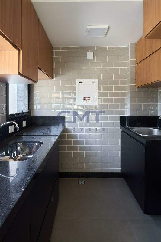 Cozinha com piso em porcelanato e bancadas em granito e armários planejados. Área de serviço com bancada em granito.