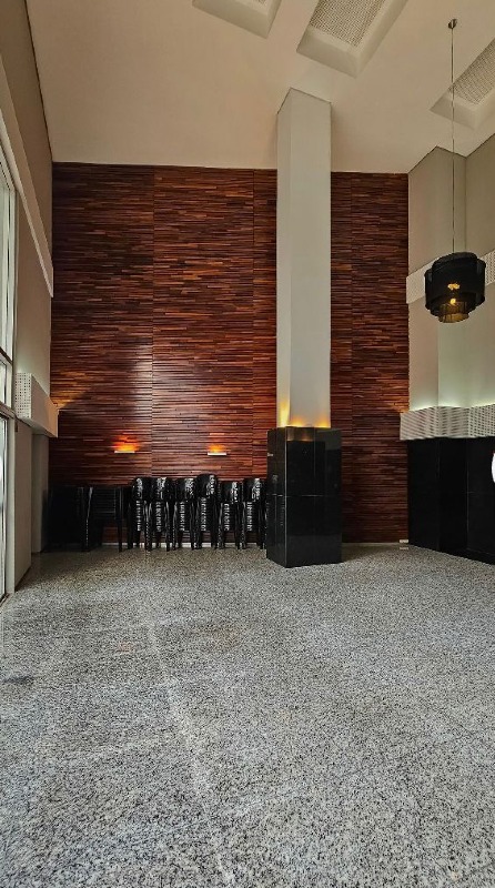1 sala ampla para dois ambientes, com piso em mármore claro polido, teto com rebaixamento em gesso e iluminação planejada