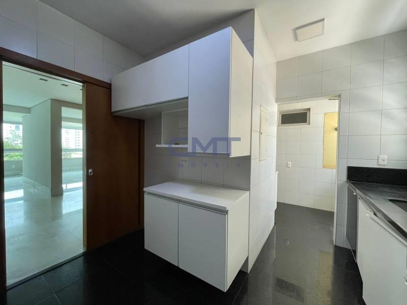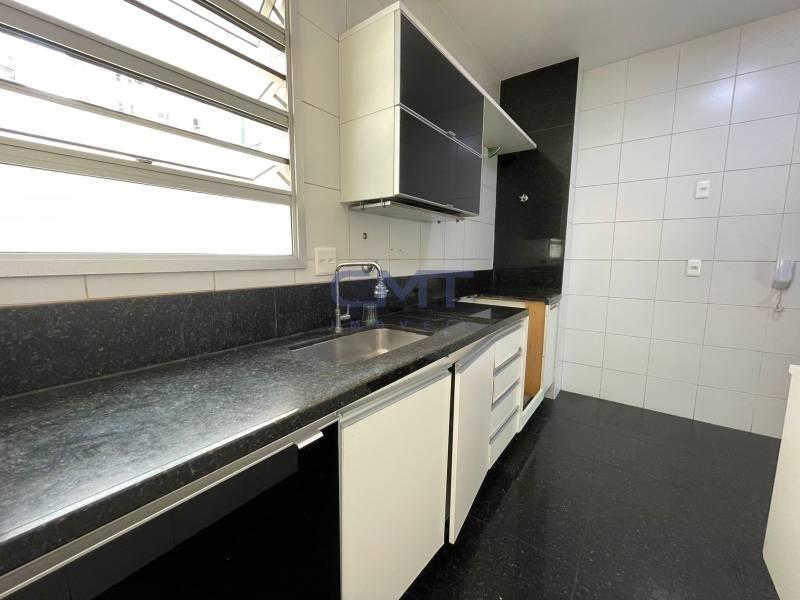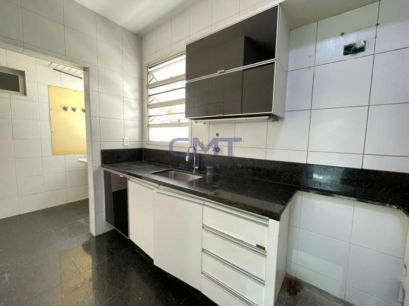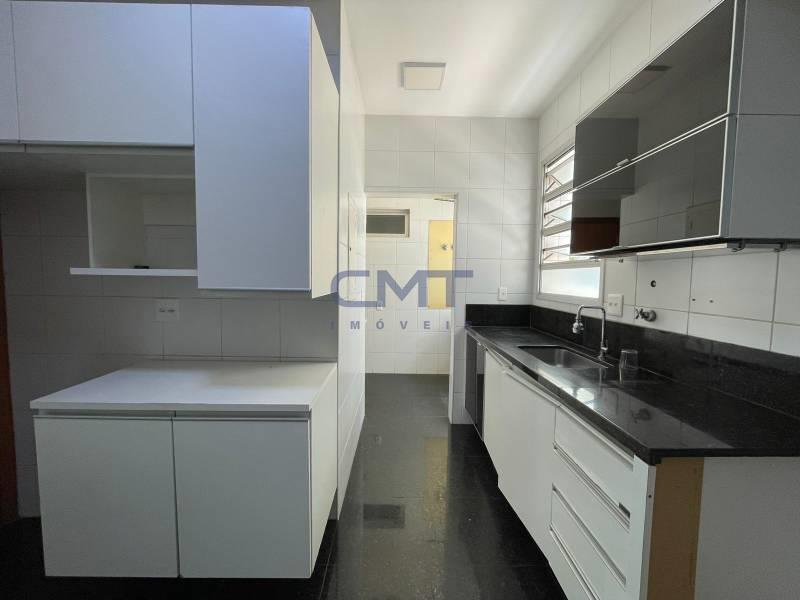 Cozinha ampla e funcional, com piso em granito preto polido, armários planejados em acabamento branco e bancada em granito