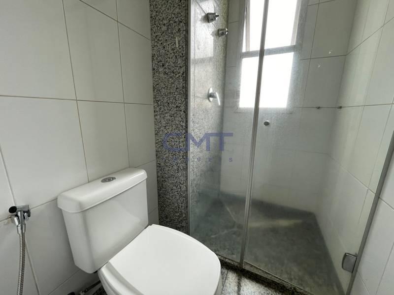 Banheiro social com bancada em granito, espelho, armários planejados e box em blindex