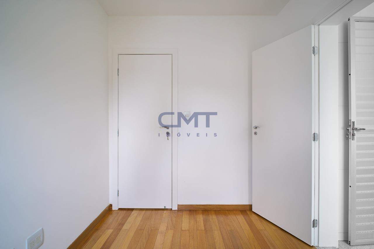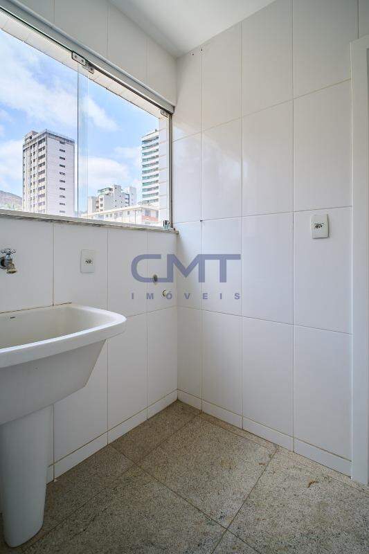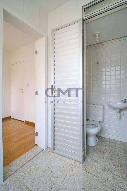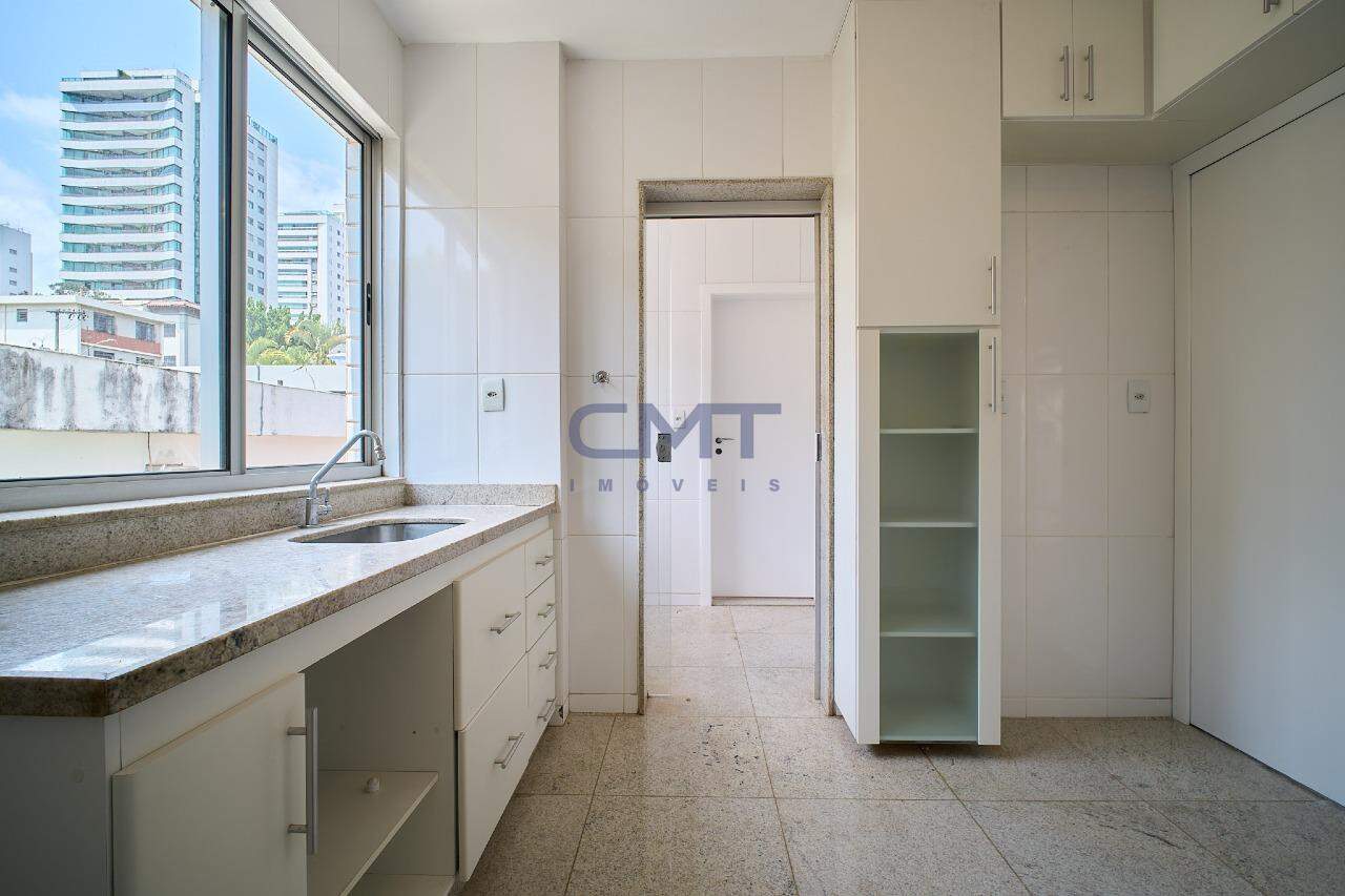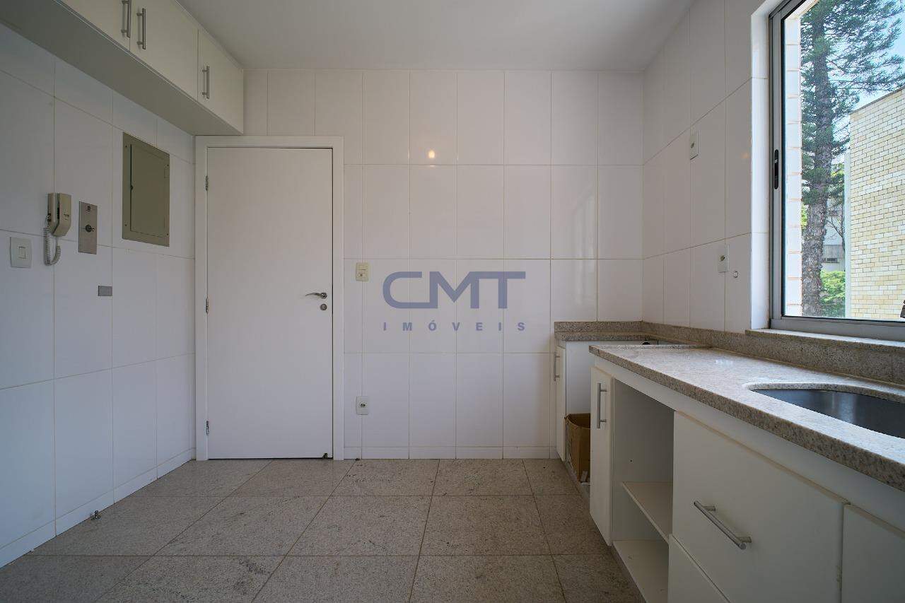 Cozinha ampla com piso e bancadas em granito. Diversos armários planejados em ótimo estado de conservação. Acesso independente à área de serviço, com piso e bancada em granito, quarto e banheiro de serviço. O quarto de serviço destaca-se pelo tamanho, e por ter acesso direto à área íntima do apartamento, podendo ser considerado um quarto funcional do imóvel.