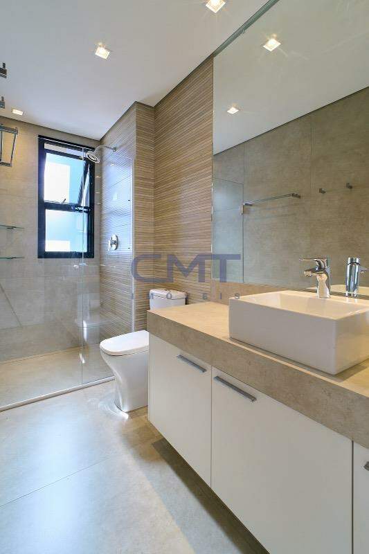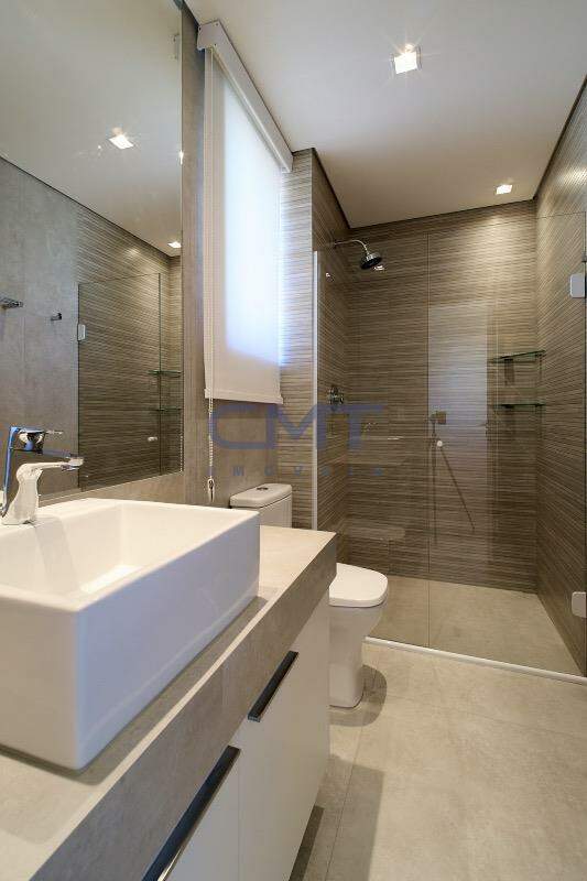 3 amplos banhos, sendo todos suítes. Todos contam com box em blindex transparente, armários planejados, piso em porcelanato e bancada com cuba sobreposta.