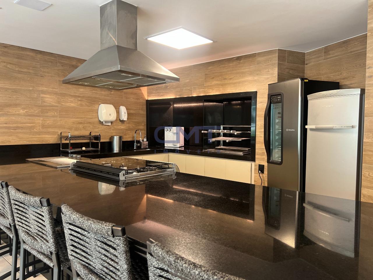 A varanda gourmet com churrasqueira integra-se à sala e conta com marcenaria planejada, criando um ambiente ideal para receber. O lavabo complementa a área social com praticidade.