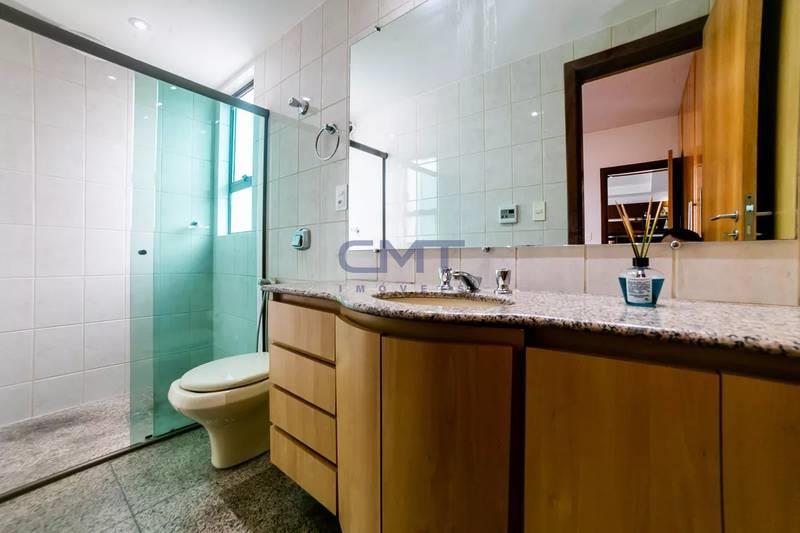 1 Quarto amplo com armários, piso em vinílico de madeira, sendo a suíte com bancada em granito, armários, espelho e box em blindex
