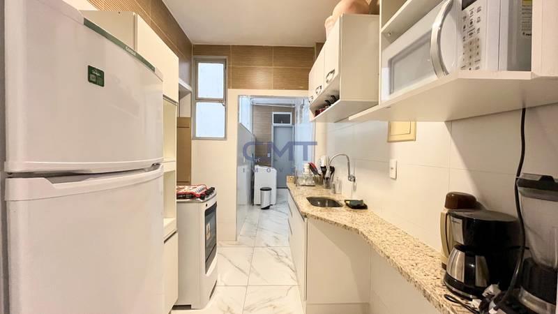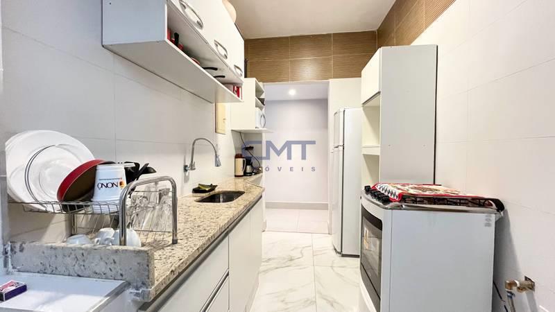 Cozinha funcional, equipada com armários planejados, bancada em mármore e piso em porcelanato.