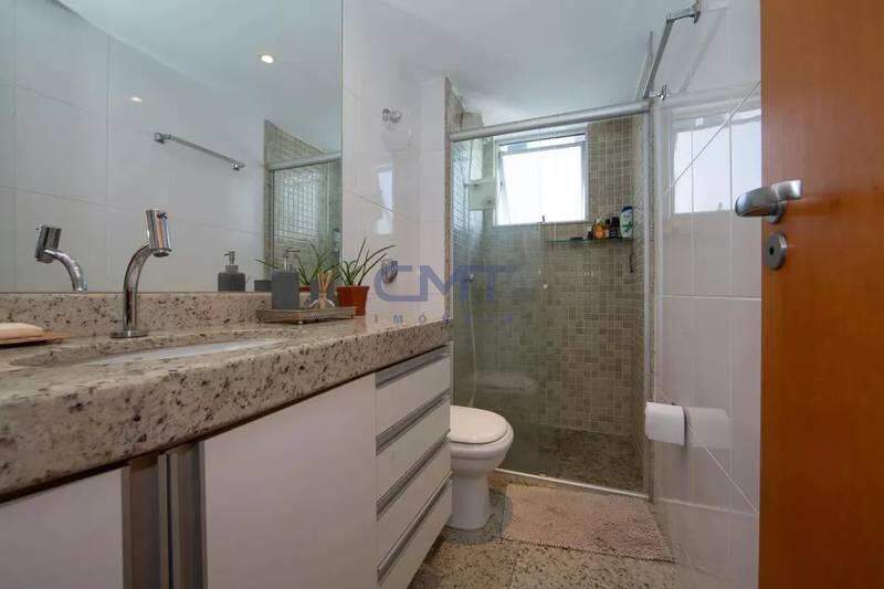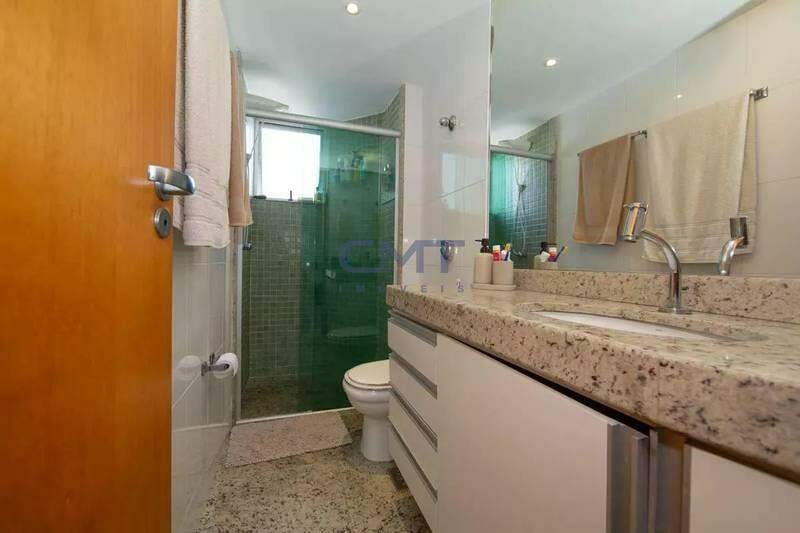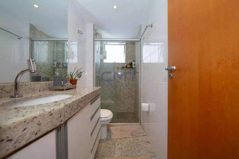Banheiro social com bancada em granito, espelho e box em blindex