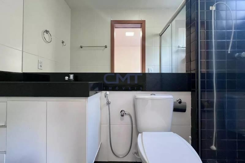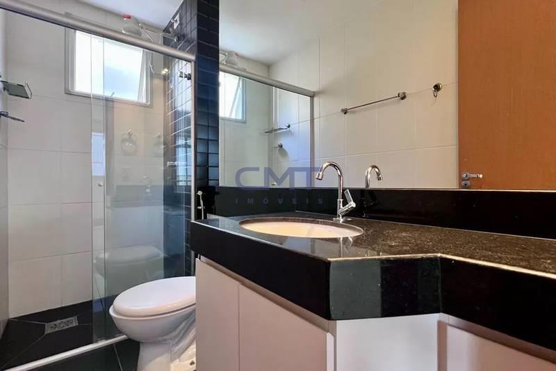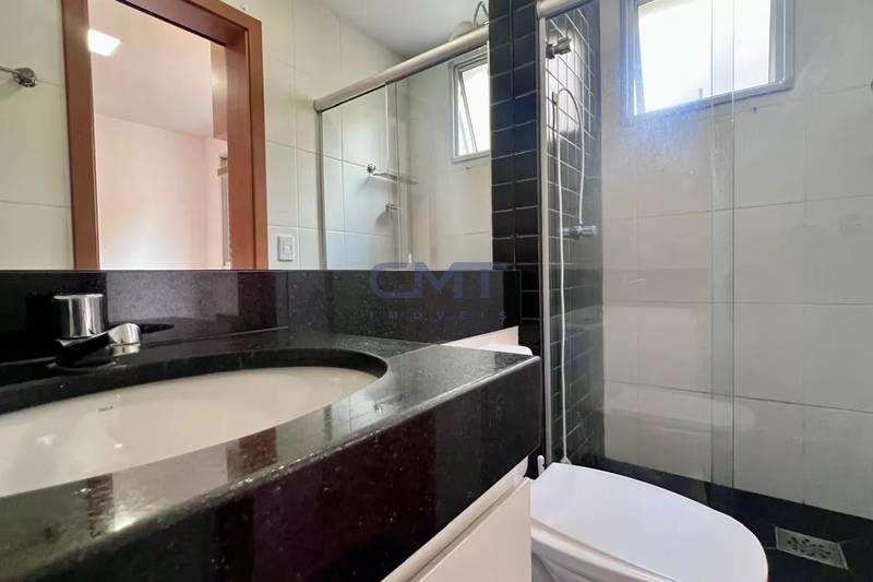 Banheiro social com bancada em granito, espelho, armários e box em blindex