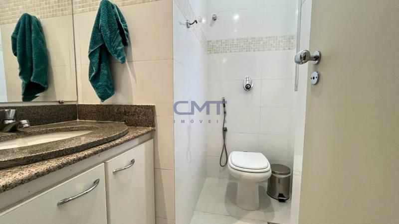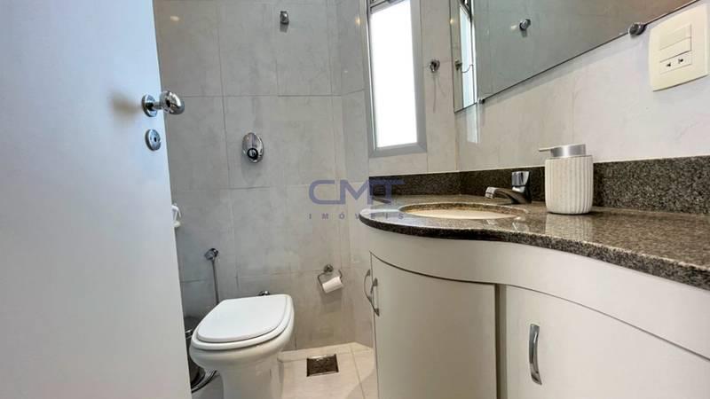 Banheiro social com espelho, bancada em granito, armários e box em blindex
