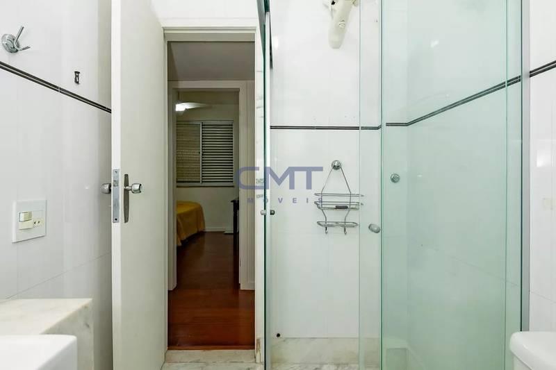 Banhos (social e suíte) com armários, espelho, bancada em mármore e box em blindex..