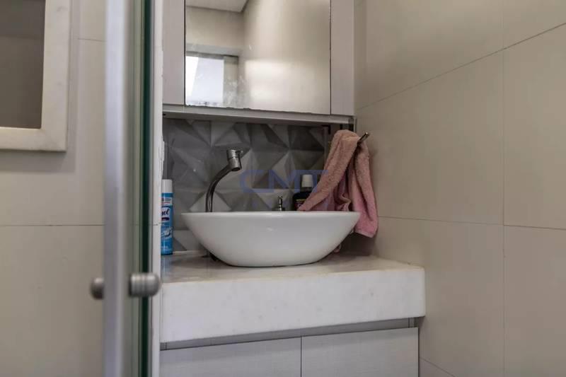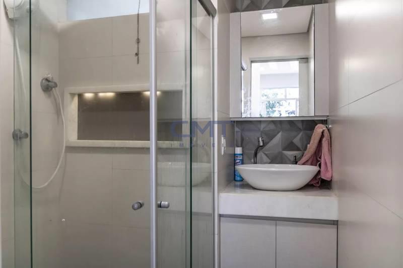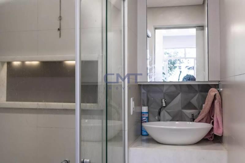 Banheiro social com bancada em granito, espelho, armários e box em blindex
