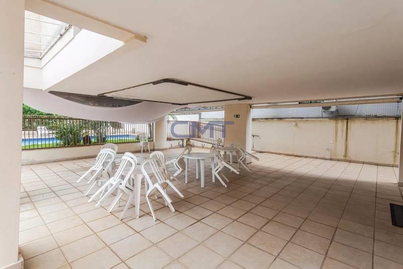 Área de lazer com salão de festas, piscina e área livre.
