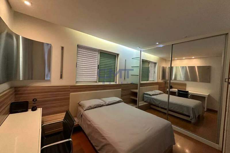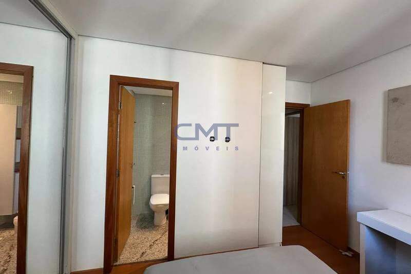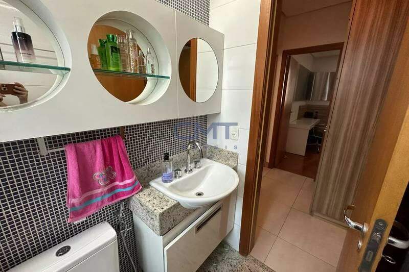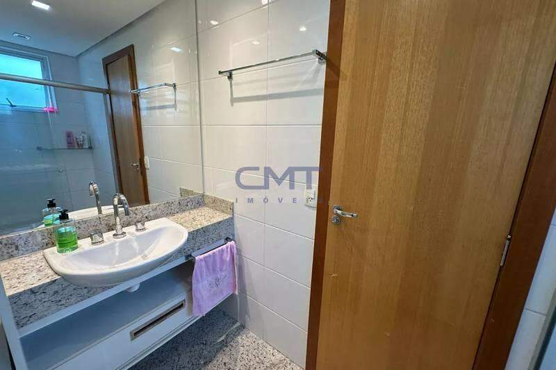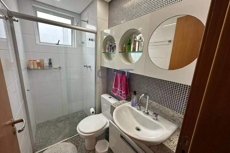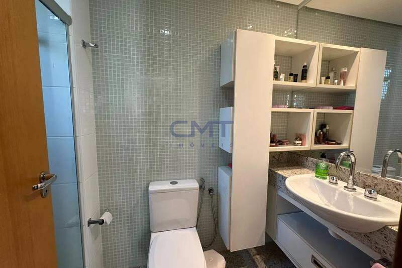 Banheiro social com bancada em granito, armários, espelho e box em blindex