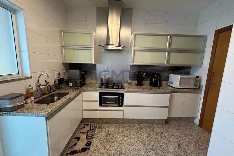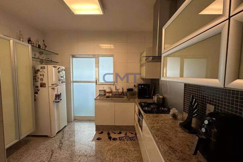 Cozinha funcional com armários planejados, piso e bancada em granito, cooktop e coifa