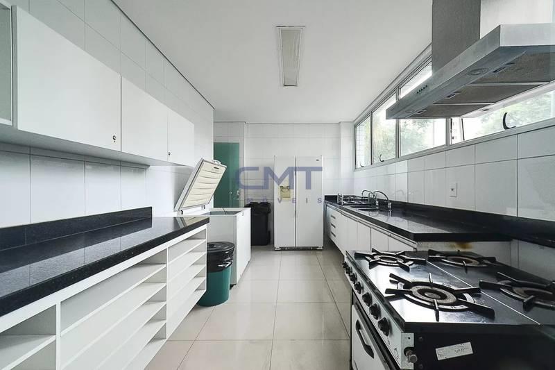 Cozinha americana com armários planejados, bancada em granito e piso em porcelanato.