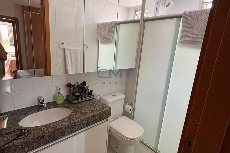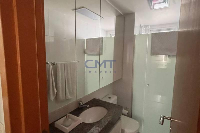 Banheiro social com bancada em granito, espelho, armários e box em blindex