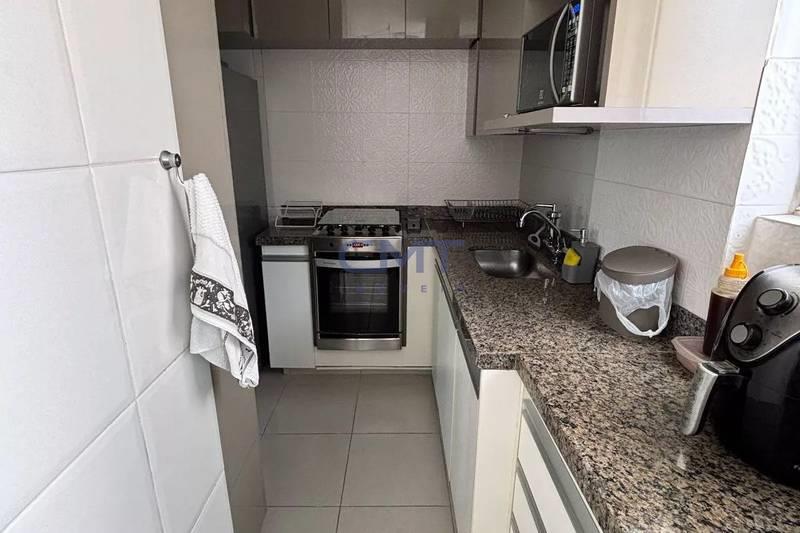 Cozinha espaçosa e funcional, com piso em porcelanato, armários planejados e bancada em granito