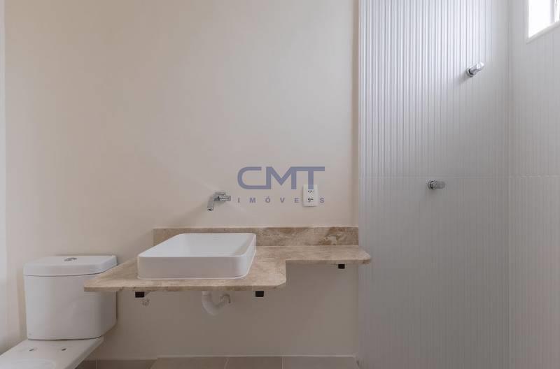 Banheiro social com armário, espelho e box em blindex