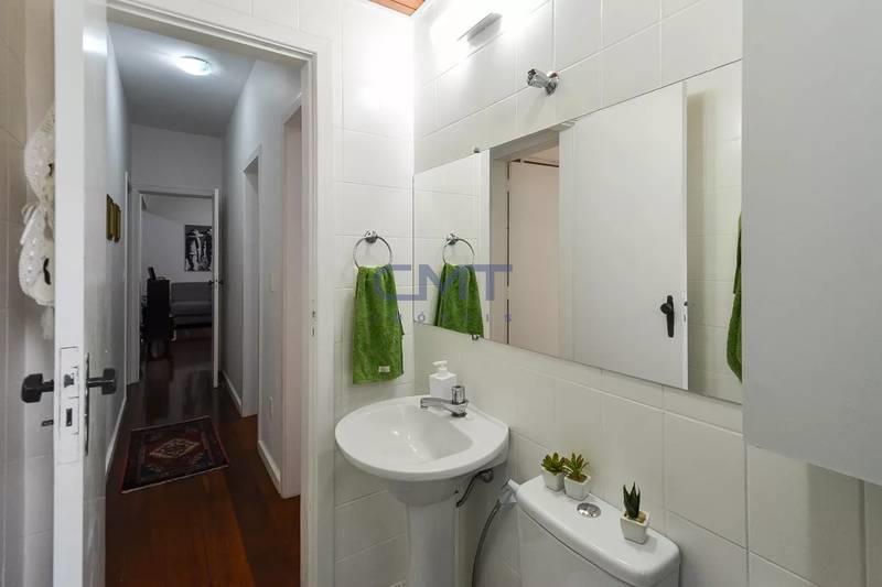 Banheiro social com pia em cuba de apoio, espelho, armários e box em blindex
