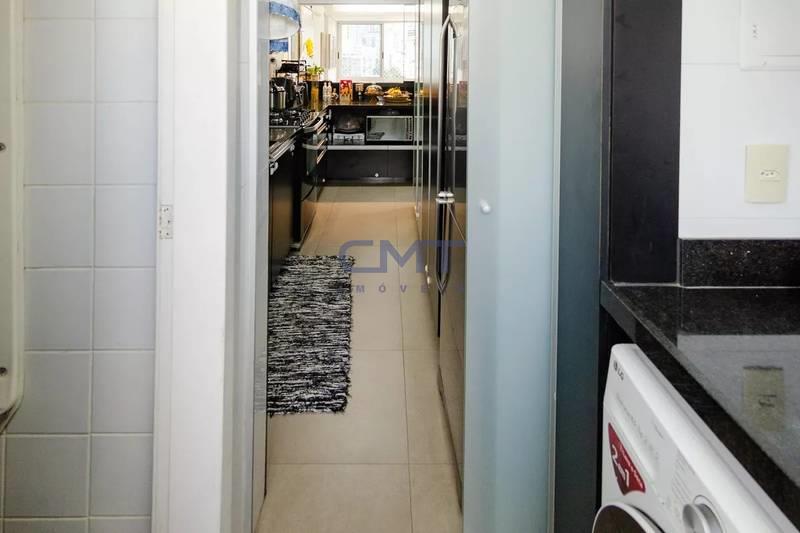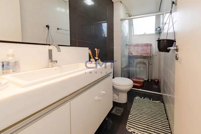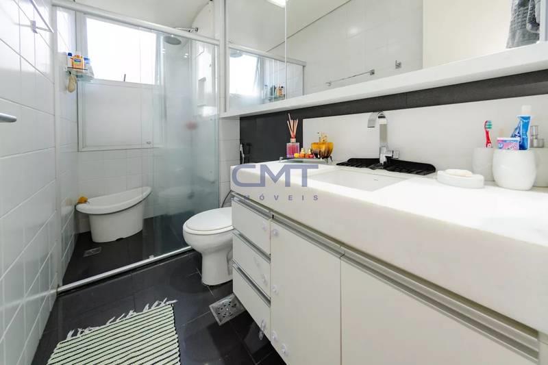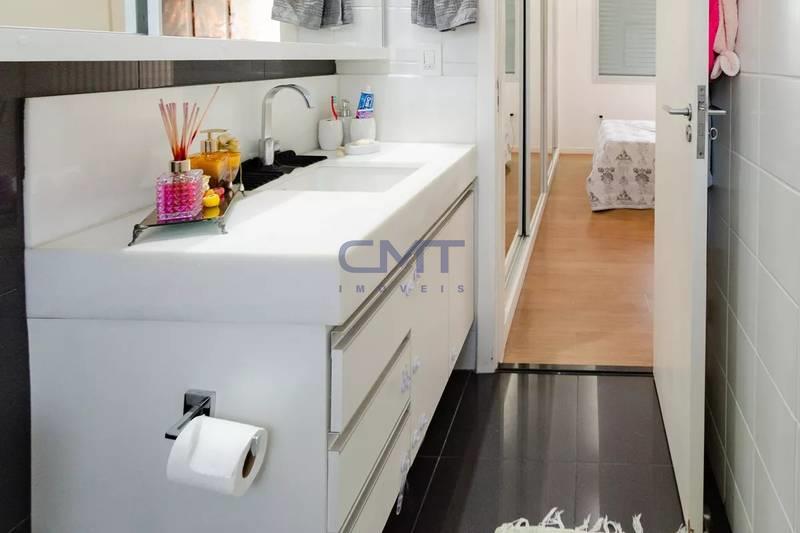 Banheiros (social e suíte) com piso em porcelanato, bancadas em mármore, armários e box em vidro. O banheiro da suíte conta ainda com armário sob a pia e armário suspenso com espelhos.