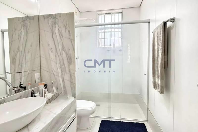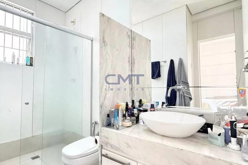 Banheiros (social e suíte) bem equipados, com box em blindex, bancadas em granito e espelhos.