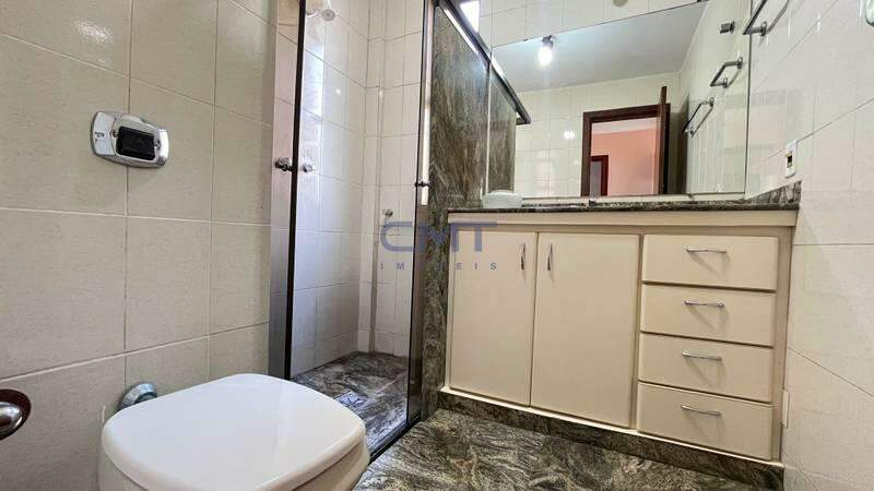Banheiro social com bancada em granito, espelho, armários planejados e box em blindex