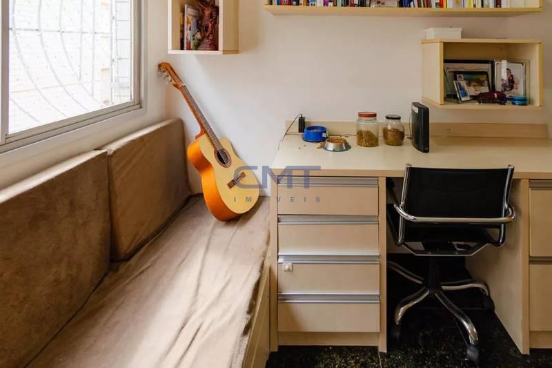 04 quartos com piso em taco e armários planejados, sendo 01 suíte com ar-condicionado e 01 quarto transformado em escritório, ideal para home office.