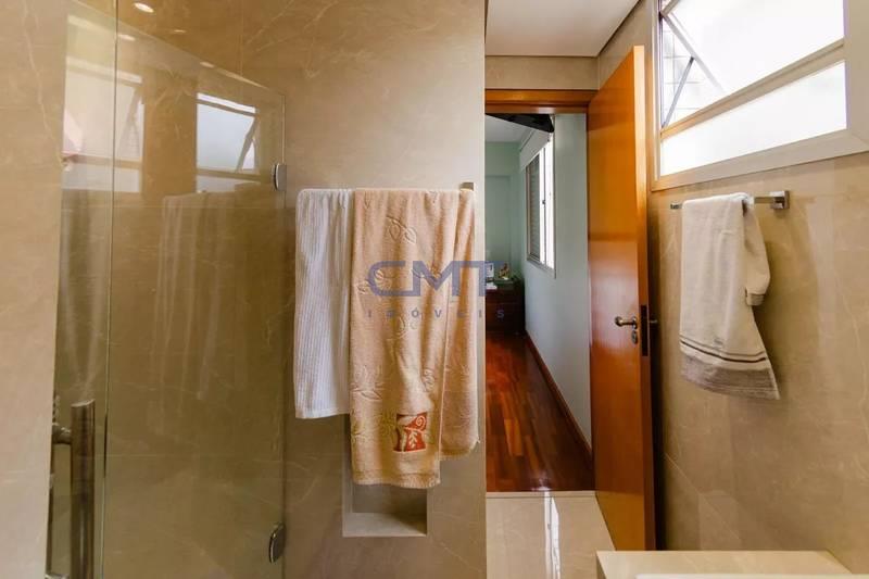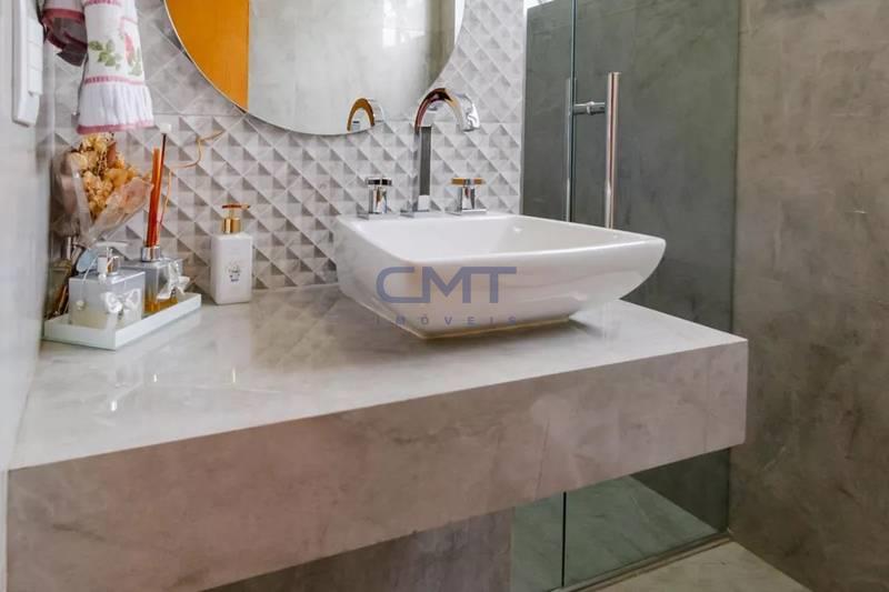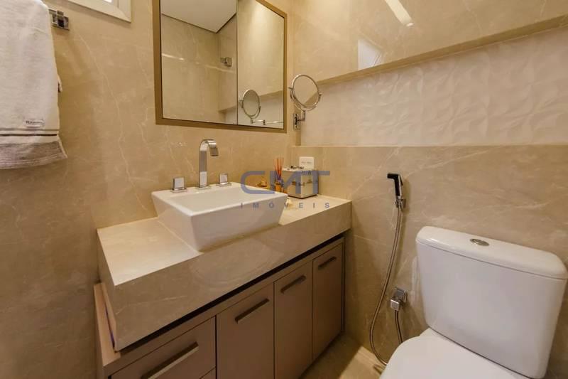 Banhos (social e suíte) com bancadas em granito, armários, box em blindex e espelhos.