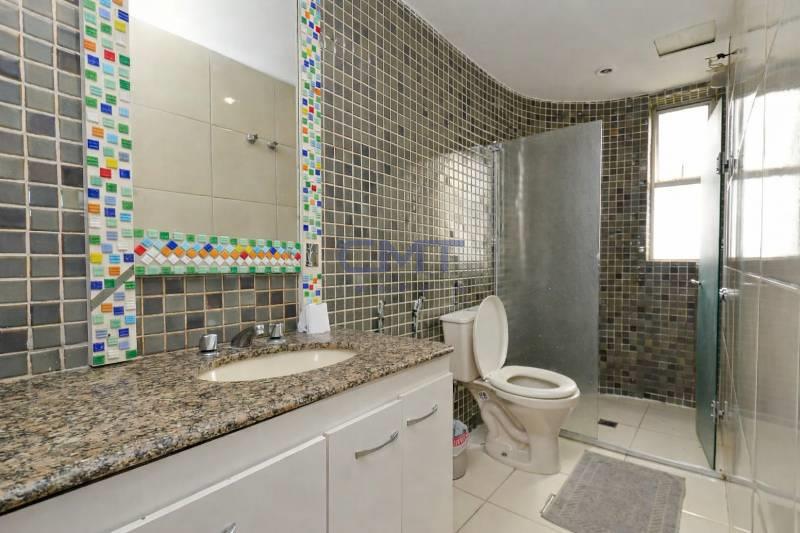 Banheiro social com espelho, bancada em granito, armários e box em blindex