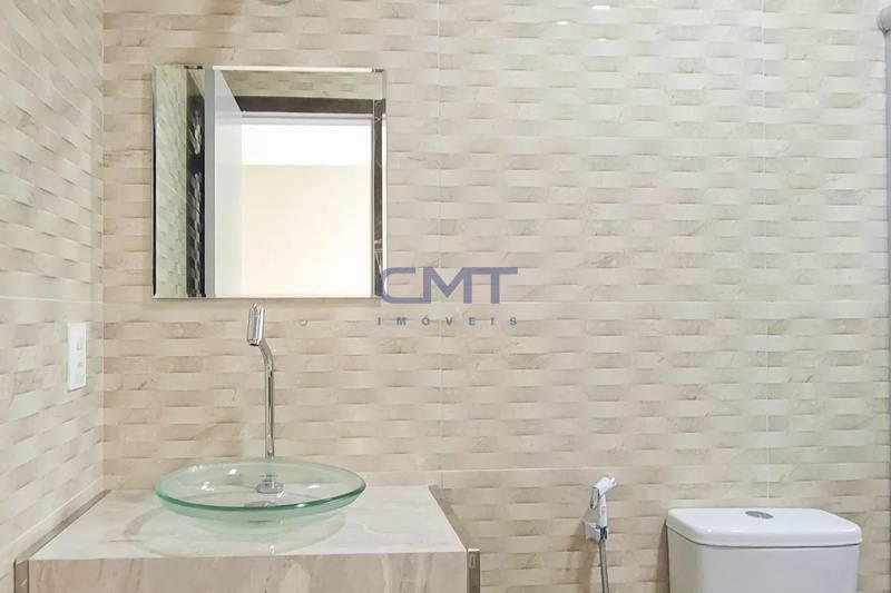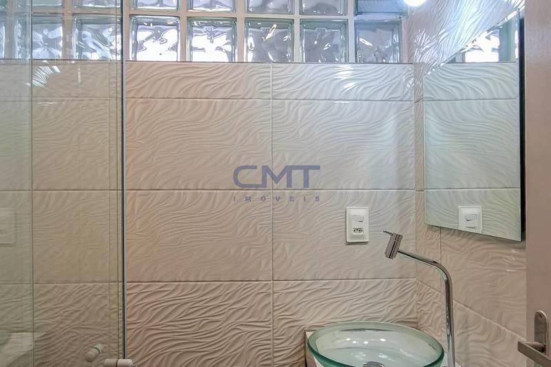 Banheiro social com bancada em granito, espelho, pia em cuba de apoio e box em blindex