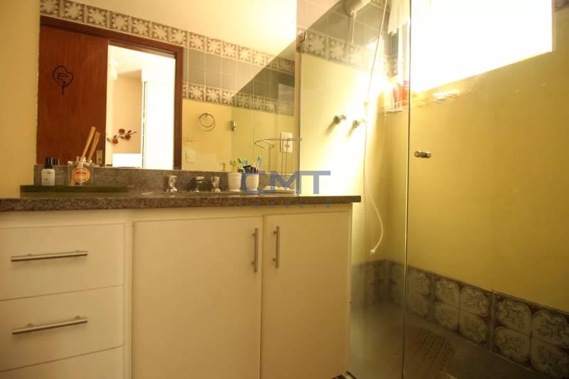 Banheiro social com bancada em granito, espelho, armários e box em blindex