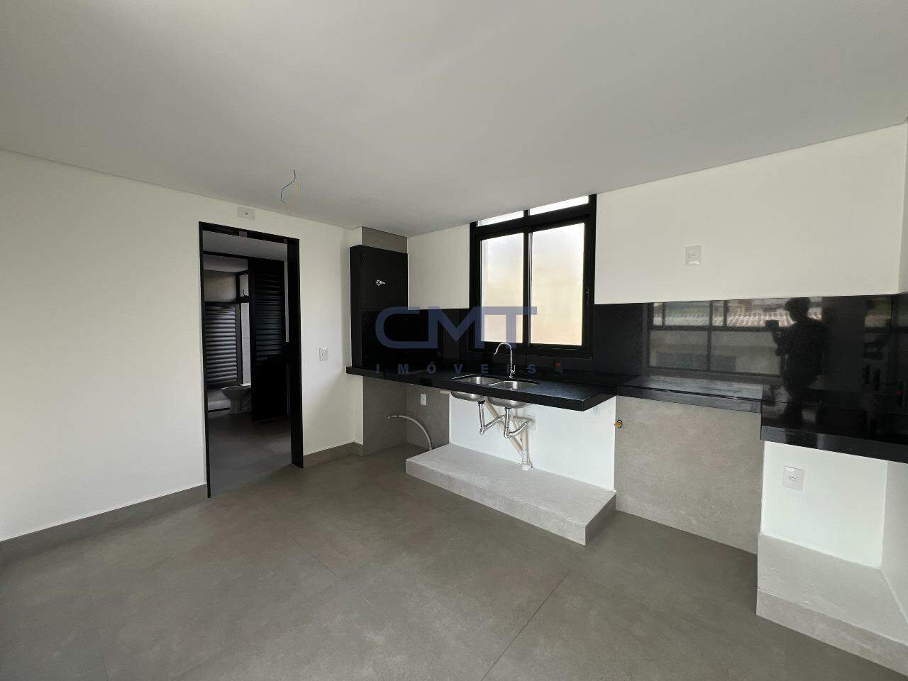 Cozinha ampla com bancada em granito e piso em porcelanato, oferecendo praticidade e funcionalidade.