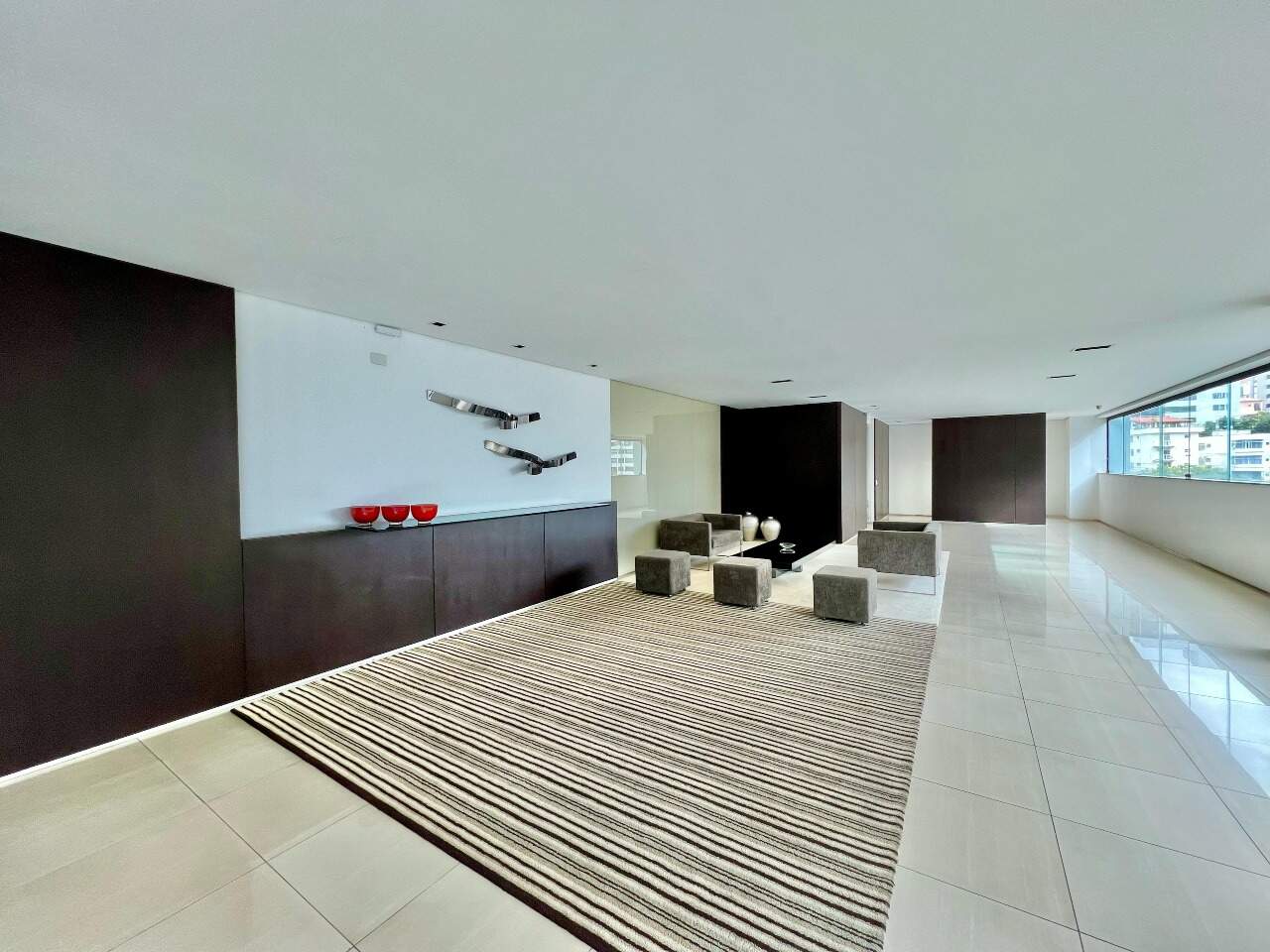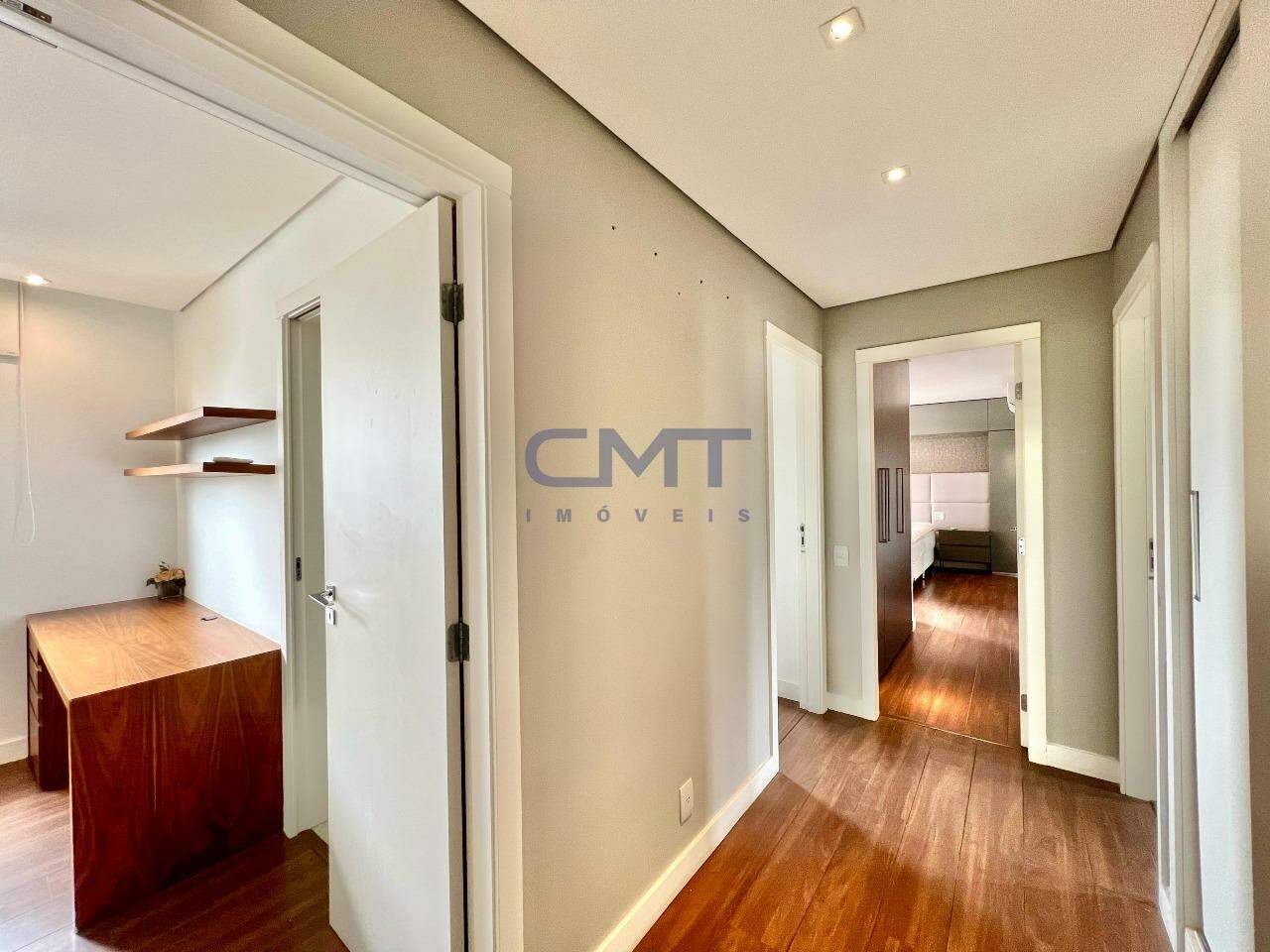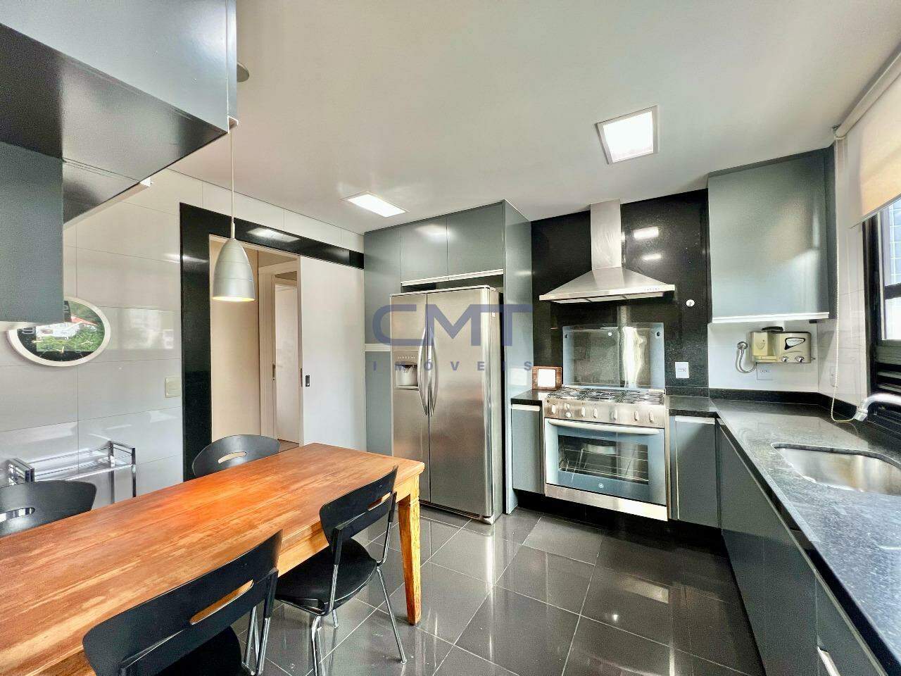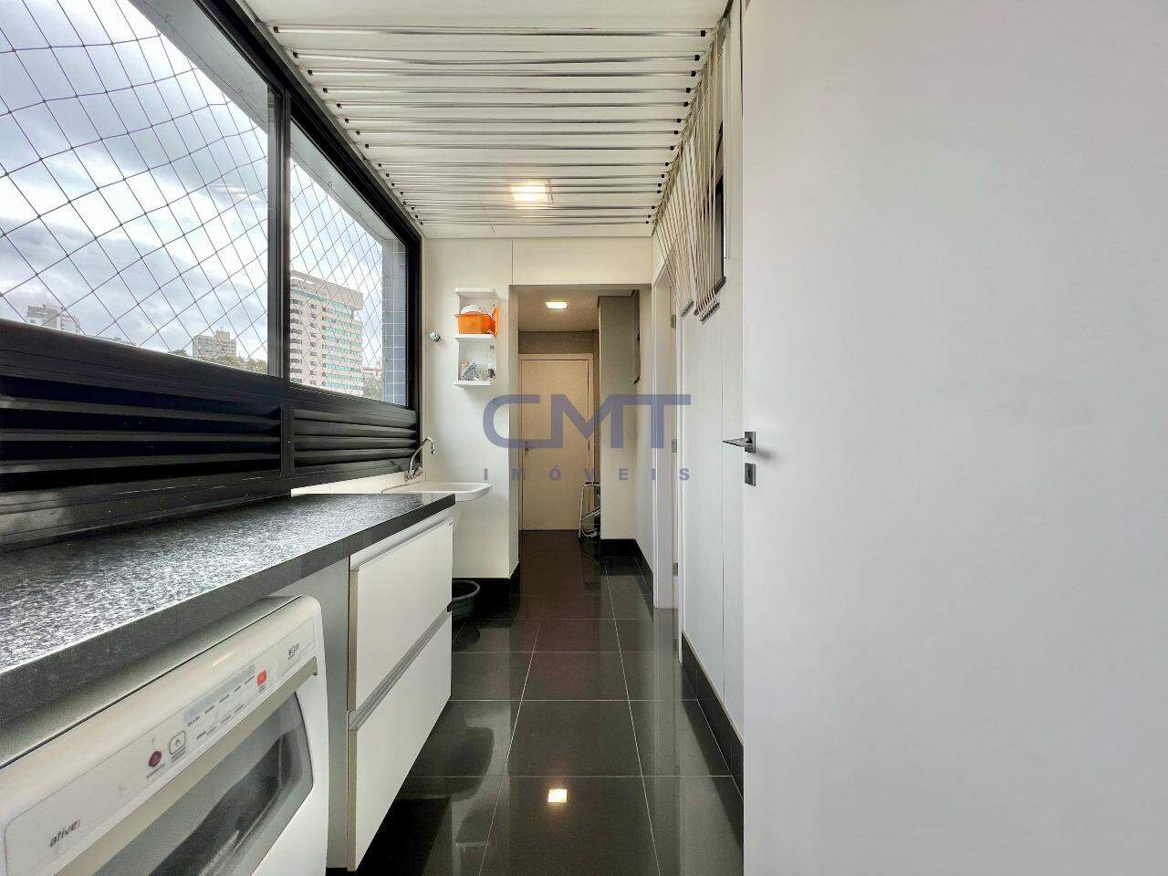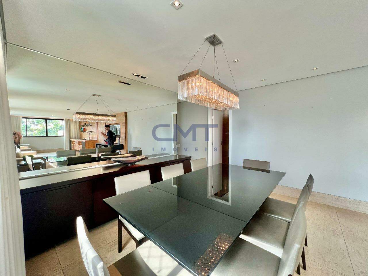 Sala para dois ambientes com rebaixamento de teto e projeto luminotécnico, lavabo. Quatro quartos com armários planejados, sendo duas suítes, uma delas máster com closet. Banheiro social com armário sob bancada em granito e box em vidro temperado. Cozinha mobiliada com armários planejados e bancadas em granito/porcelanato. Área de serviço independente e dependência completa de empregada (DCE). Piso dele variado: porcelanato, laminado, cerâmica e granito, conforme ambiente.