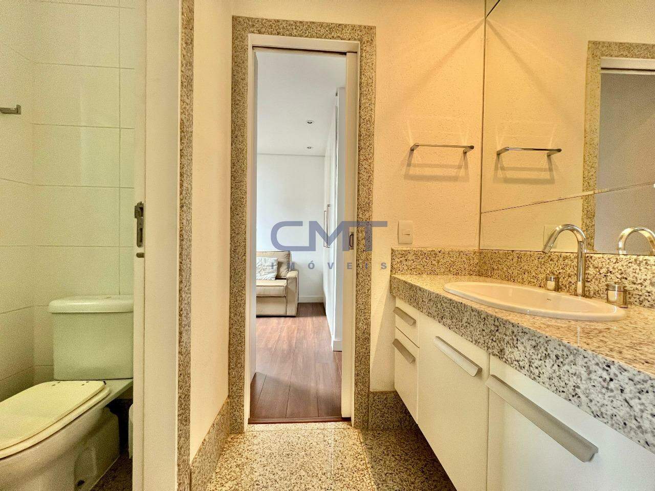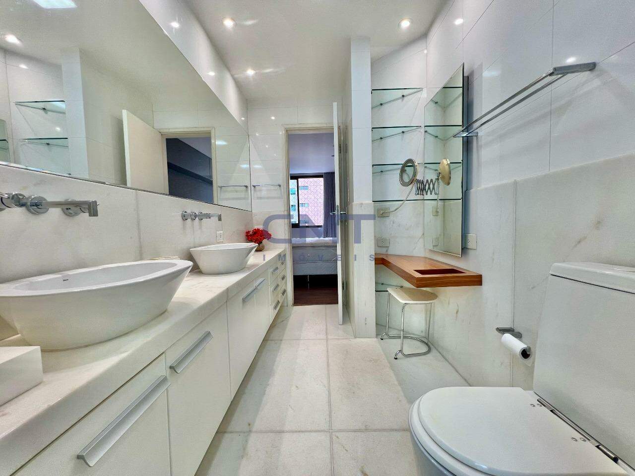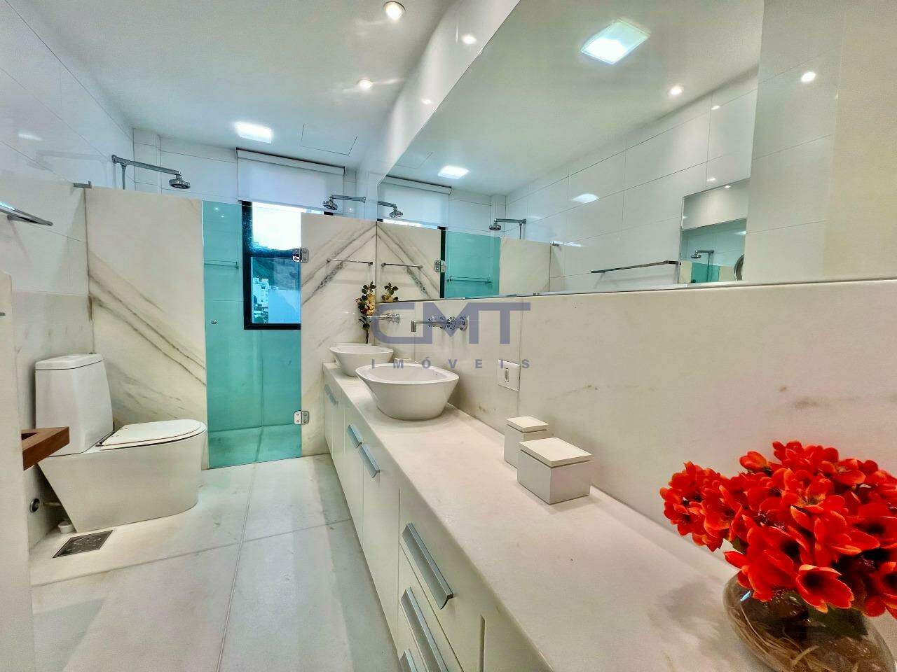 Total de 4 banheiros: 2 suítes, 1 social + lavabo; todos com box em vidro temperado, armários planejados e bancadas em granito.