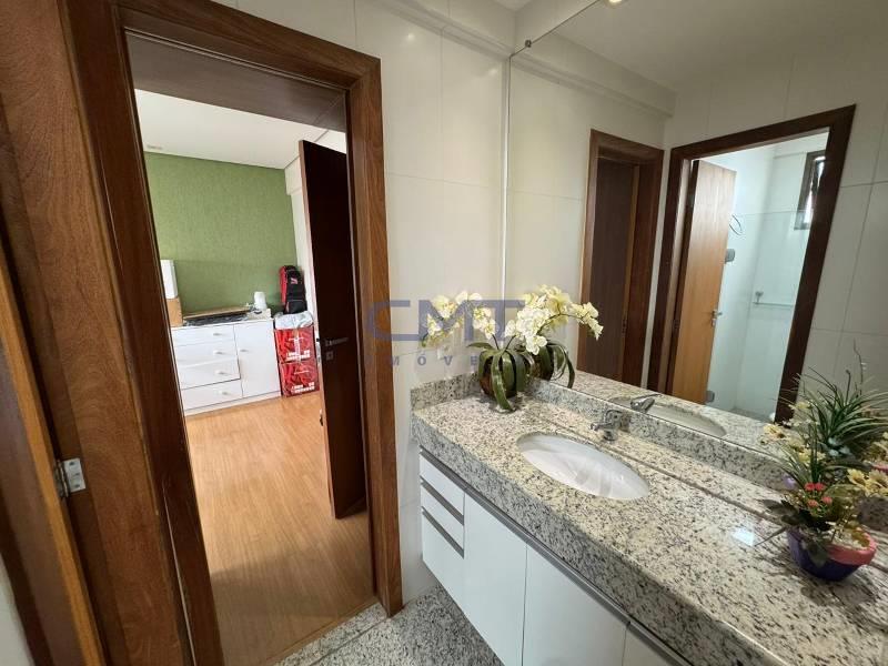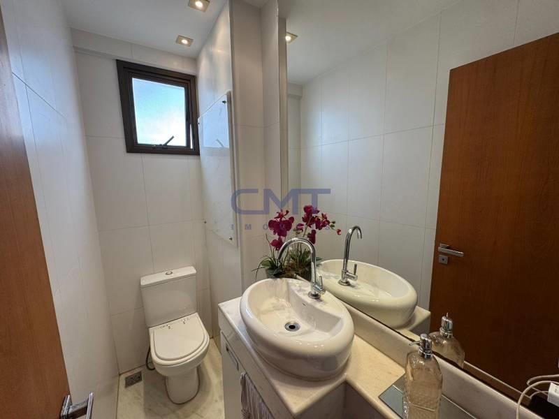 A sala ampla para 3 ambientes oferece sofisticação e integração, com rebaixamento em gesso, piso em mármore, painel planejado e lavabo. A varanda é ampla, proporcionando excelente ventilação e iluminação natural.