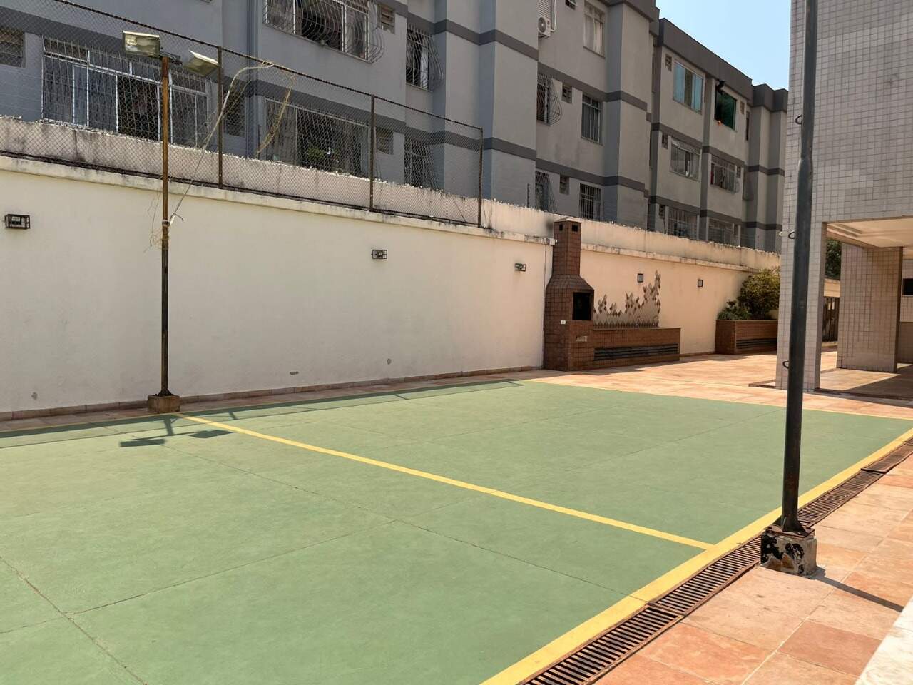 Área de lazer com churrasqueira, salão de festas, quadra poliesportiva, playground, sauna, piscina e jardim.