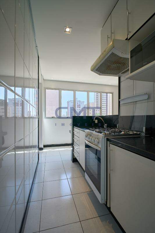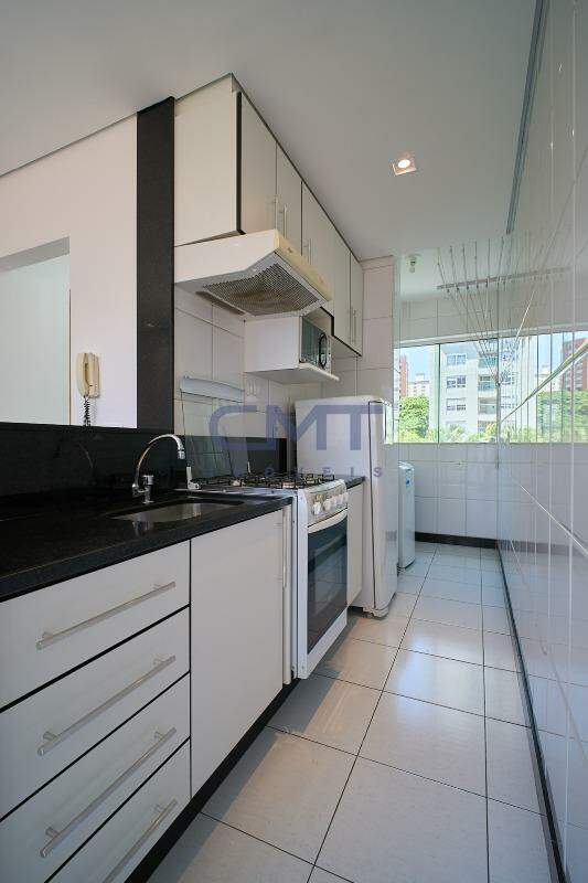 Cozinha americana ampla com piso em cerâmica e bancadas em granito. Armários planejados em ótimo estado de conservação. Conta com espaço para área de serviço com armário planejado.