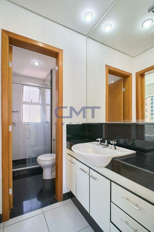 Banho social com área íntima separada. Conta com box em blindex transparente e piso em granito. Área do lavatório conta com bancada em granito, iluminação e armários planejados.
