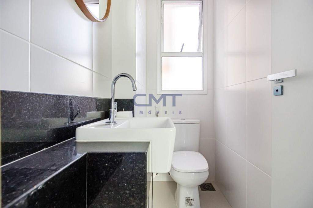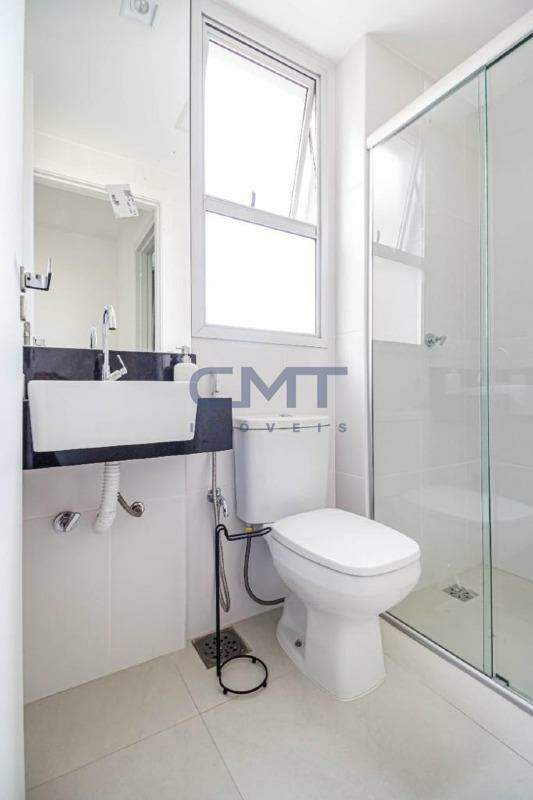 Banho social composto por um box de vidro temperado, bancada em granito negro, piso em porcelanato e parede em cerâmica.