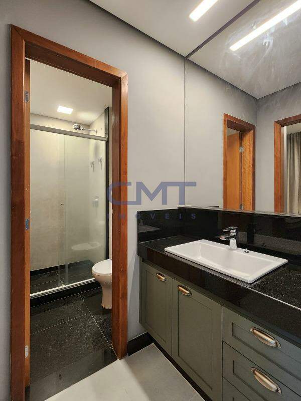 Banho social com área íntima separada. Conta com box em blindex transparente e piso em granito. Área do lavatório conta com bancada em granito, iluminação e armários planejados.