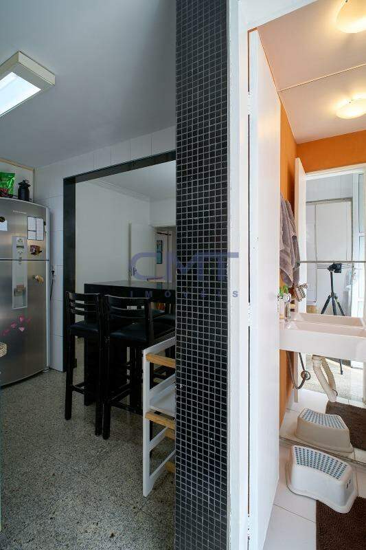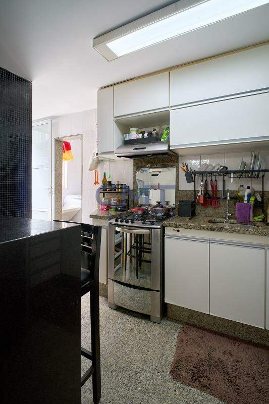 Cozinha americana ampla com piso e bancadas em granito. Armários planejados. Acesso independente à área de serviço, com quarto de serviço.