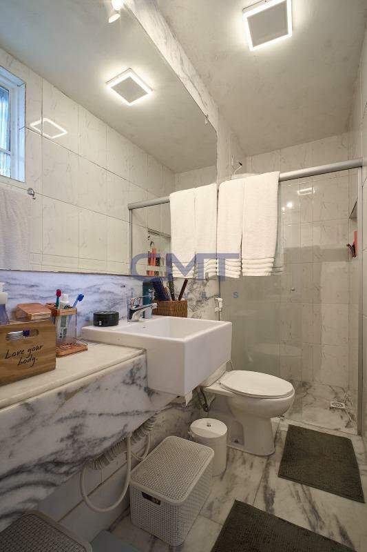 2 amplos banhos, sendo 1 suíte e 1 social. Ambos com box em blindex transparente, armários planejados, piso e bancada em granito e mármore na suíte.