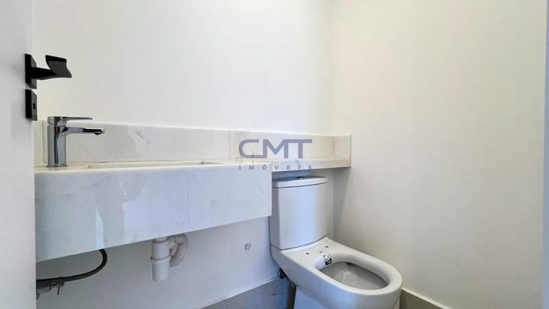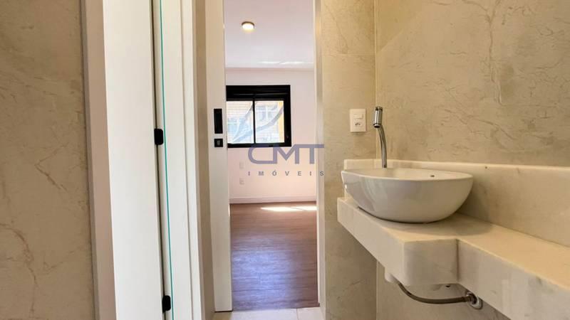 3 quartos amplos, todos com atenuação de ruídos, piso vinílico de madeira, sendo uma suíte com bancada em mármore branco e piso em porcelanato, e duas semi-ssuítes com piso em porcelanato e pia em cuba de apoio; o banheiro tem porta de acesso para os dois quartos
