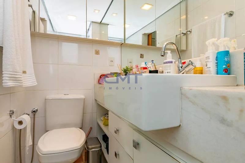 2 banheiros sociais, sendo um com espelho, bancada em granito, armários e box em blindex, e outro localizado na área externa da área privativa