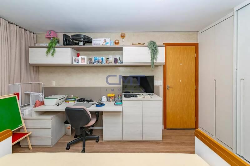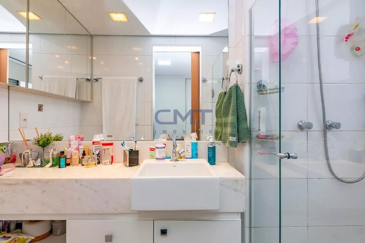 3 quartos amplos, todos com piso em vinílico de madeira, teto rebaixado, iluminação planejada e armários, sendo uma suíte com bancada em mármore, armários, espelho e box em blindex