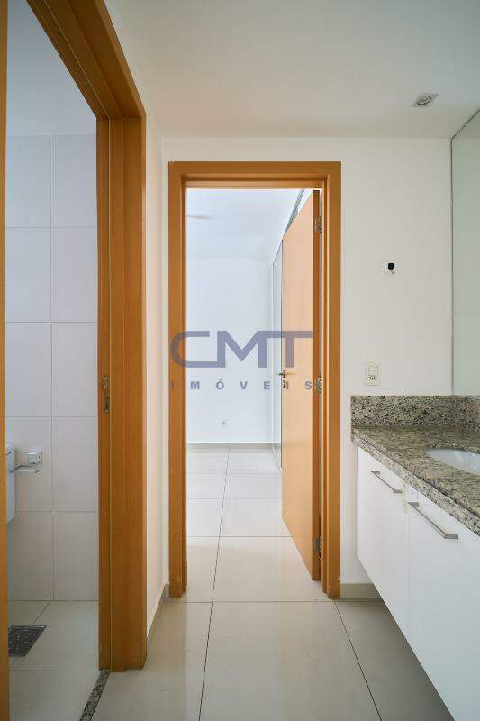 Banho social com área íntima separada. Conta com box em blindex transparente e piso em granito. Área do lavatório conta com bancada em granito, iluminação e armários planejados.