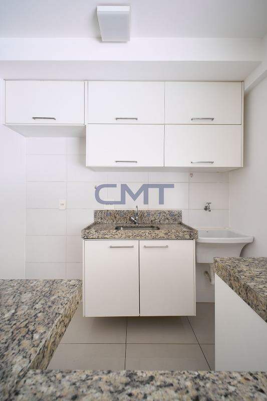 Cozinha americana ampla com piso em porcelanato e bancadas em granito. Armários planejados em ótimo estado de conservação.