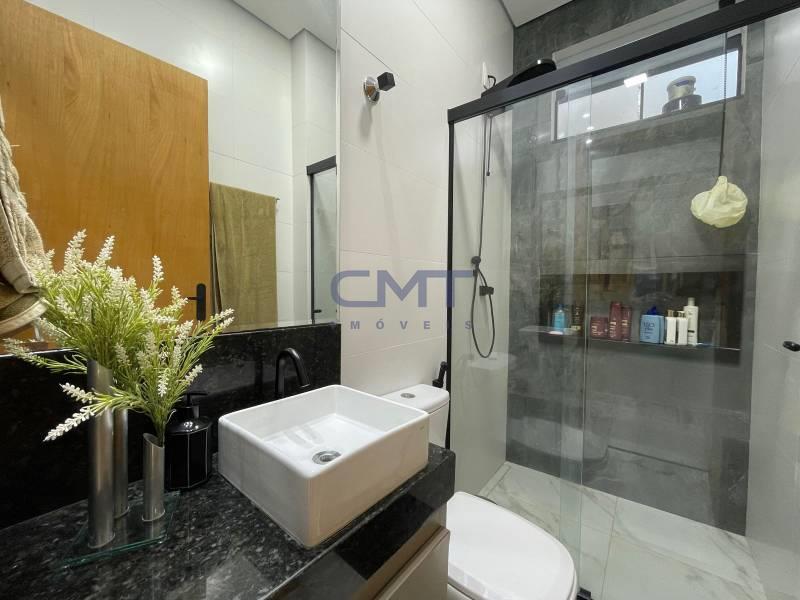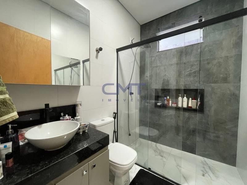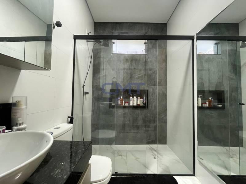 Banheiros (social e suíte) com excelente acabamento, espelho, armários e box em blindex.
