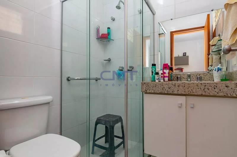Banheiros (suítes e 1 social) com armários, bancadas em granito, box em vidro e piso em porcelanato fosco.