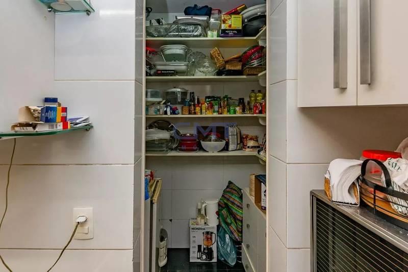 Cozinha funcional com armários planejados, bancada em granito, piso em granito e despensa.